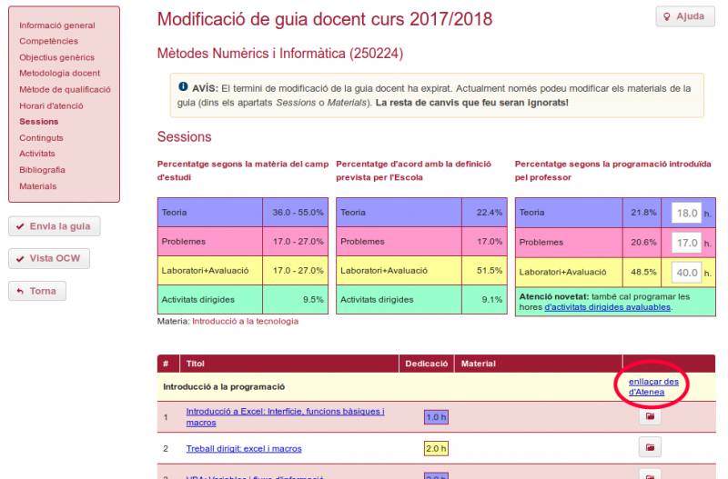 Cal accedir al Portal Camins i, un cop autenticats, accedir a l'apartat «Manteniment guia docent». Escolliu l'assignatura que us interessa, accediu al formulari de modificació de la guia i, després, a l'apartat «Sessions». Veureu que cada tema té un enllaç anomenat «enllaçar des d'Atenea»: